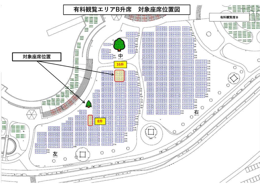 今後の対応としましては、B升席(4人まで利用可)で視界不良により観覧ができなかった一部の席について、①チケット代金の全額返金、又は、②次回大会のA升席(4人まで利用可、12,000円相当)チケット進呈、のいずれかをお選びいただく形で対応させていただきます。